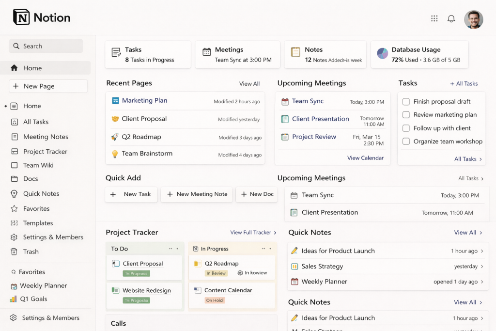 Notion blends documentation, lightweight databases, and simple task tracking into a single workspace. For growing teams, Notion often becomes the “how we work” handbook — onboarding pages, playbooks, and templates that are easy to update and share. The biggest benefit is consistency: when a single source of truth exists for processes and project plans, new hires contribute faster, and fewer things need to be explained twice.