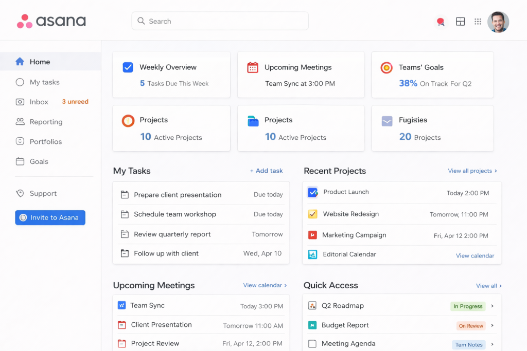 Asana organises work into projects and clear next actions, which helps teams turn discussions into accountable tasks. Its value to growing businesses is in tracing work from idea to delivery: you can see who’s responsible, what’s blocked, and where a project timeline needs adjusting. This reduces ambiguity and prevents small tasks from being forgotten in chat threads.
