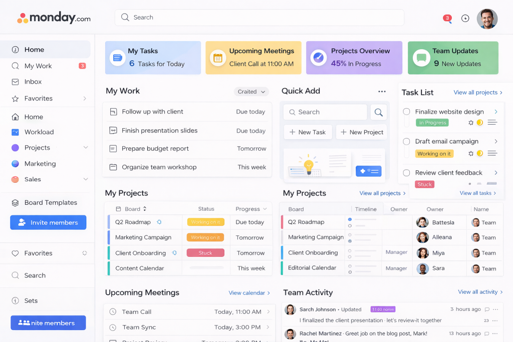 Monday.com gives teams visual ways to track progress across different workflows. Teams that adopt it often report clearer handoffs because boards make status visible at a glance. For organizations with cross-functional work, Monday helps coordinate dependencies — marketing, product, customer success — so nobody’s waiting on an invisible step before they can move forward.
