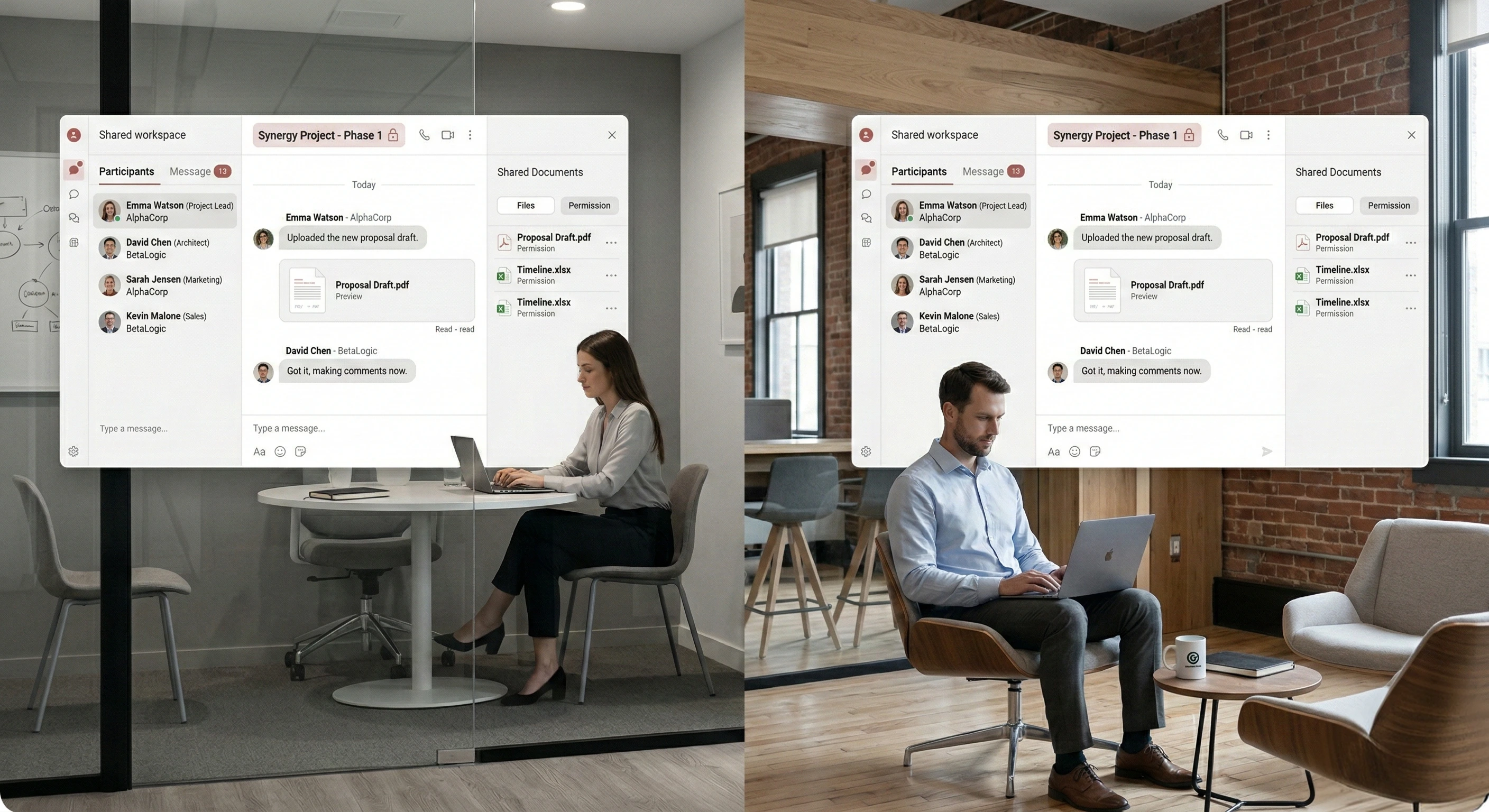 Every connection is intentional. Once connected, users unlock secure messaging, live collaboration, document sharing, and shared workspaces — without uncontrolled access.