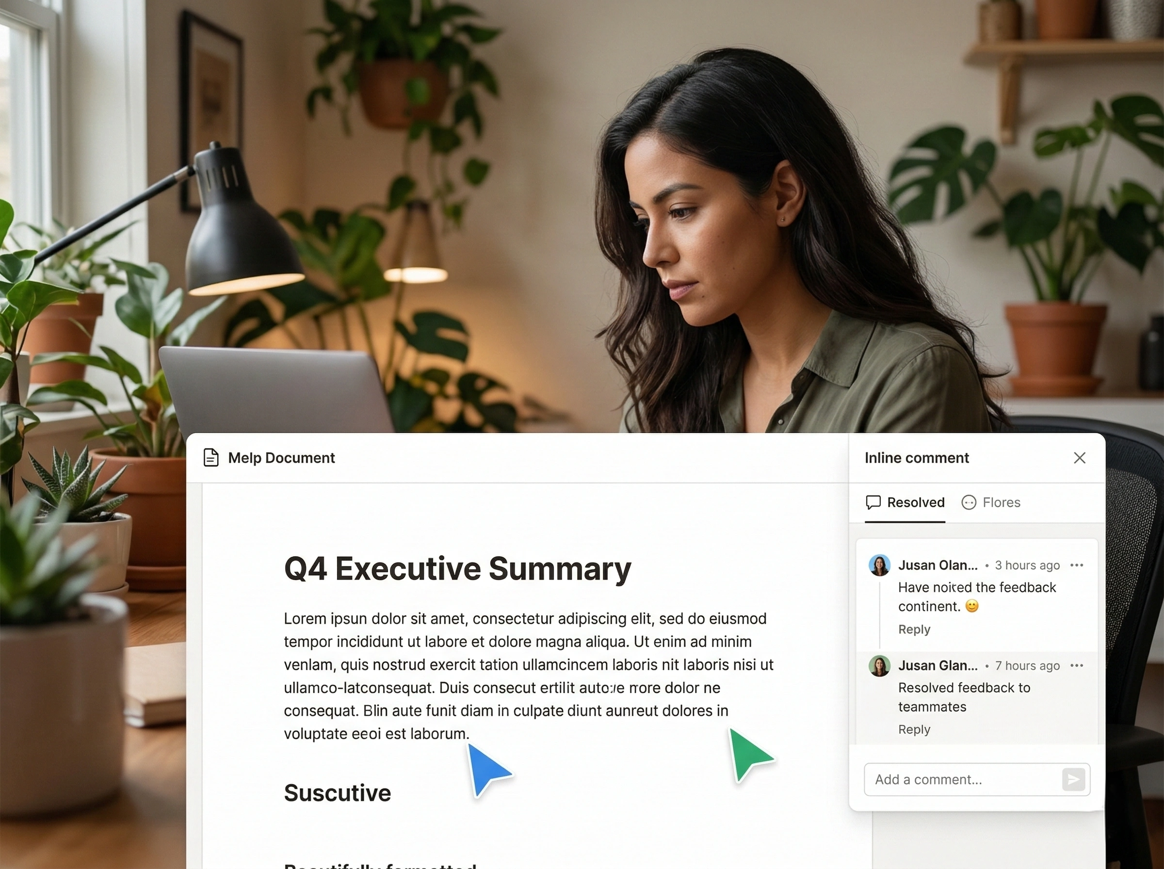 Structured rich-text editing with real-time co-authoring, inline feedback, and version transparency.