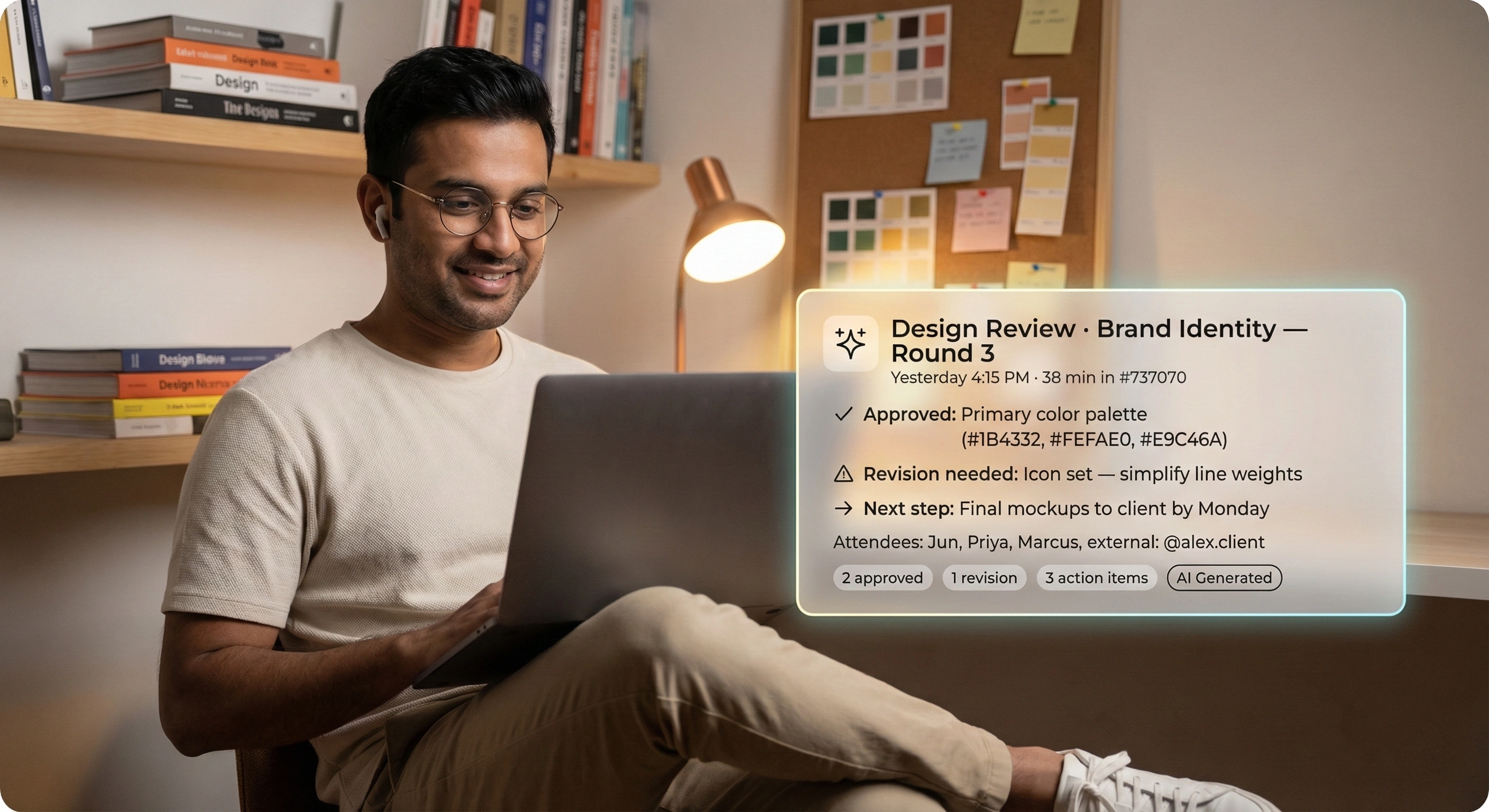 - AI-generated summaries capturing every design decision and action item automatically
